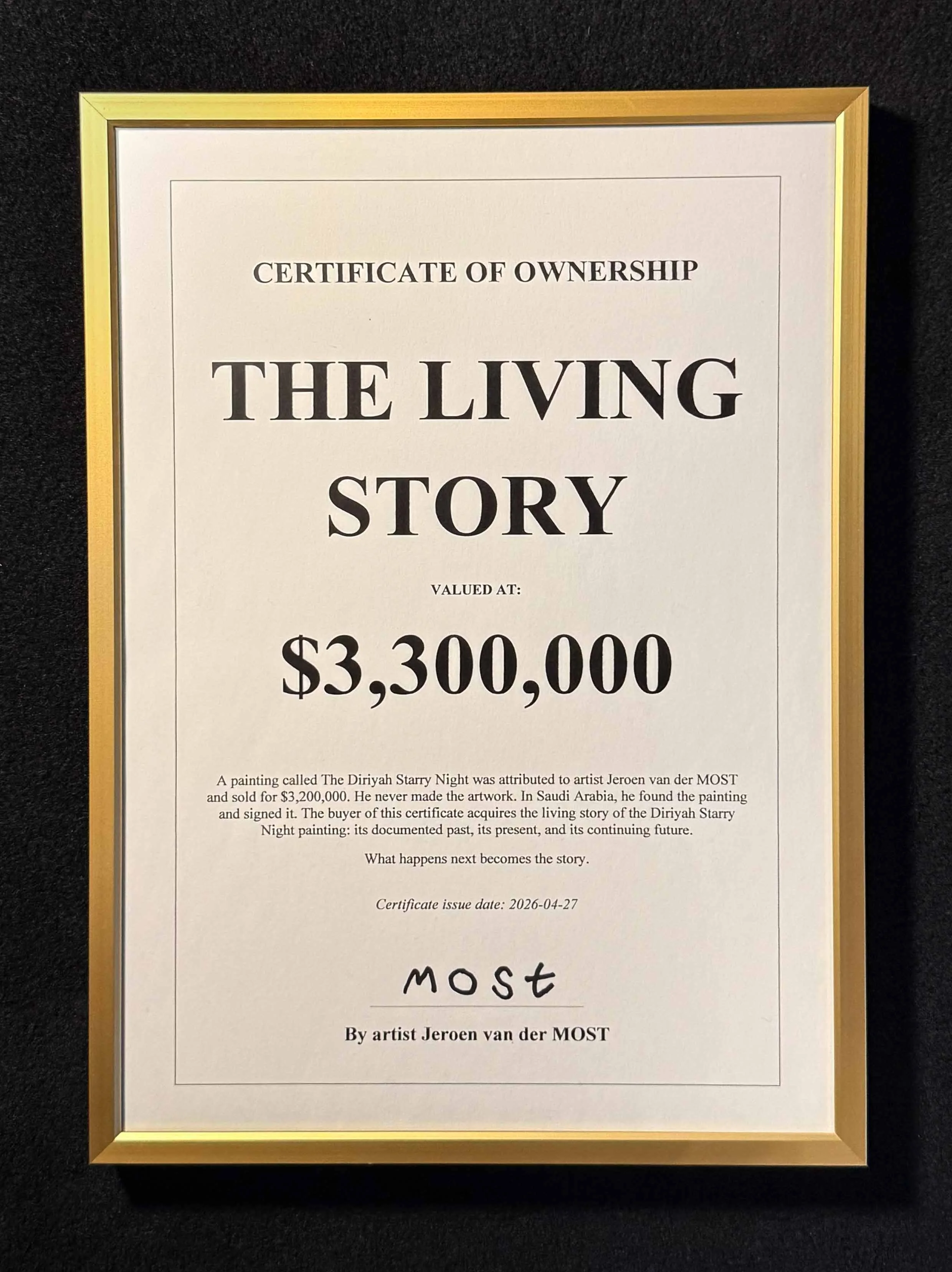 It’s why he created a certificate of ownership declaring the living story of the Diriyah Starry Night to be worth $3.3 million, deliberately more than the painting it is about.